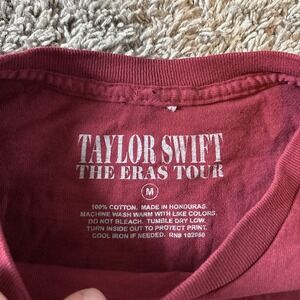 The Taylor Swift The Era Tour T-shirt in men's medium size features a red graphic print with a pop music theme. This unisex shirt has a crew neck and short sleeves, perfect for fans of the popular music artist. With a casual style and colorful design, this shirt is ideal for those who love Taylor Swift's music and want to showcase their appreciation for her.