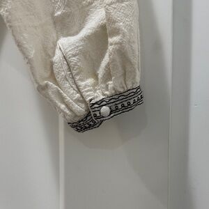 Elegant cream blouse with intricate black embroidery. Perfect for a boho-chic look.