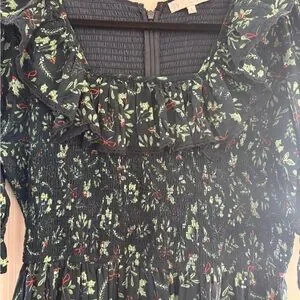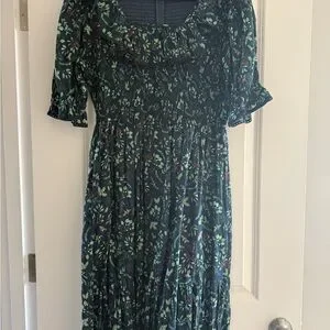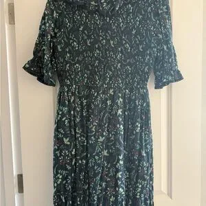Charming dark green dress with floral pattern. Features long sleeves and a ruffled neckline. Ideal for versatile styling. Worn a couple of times but too big now.
