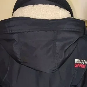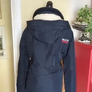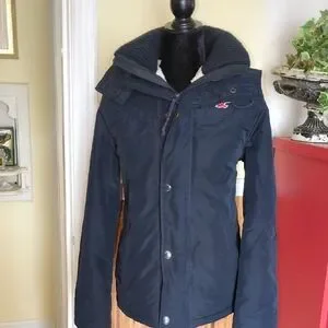 Navy jacket with cozy lining. Features button closure and high collar. Ideal for winter sports.