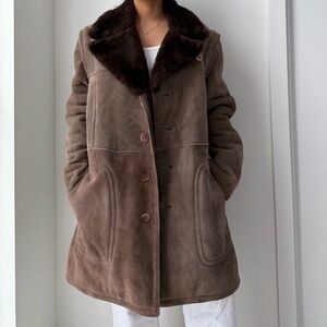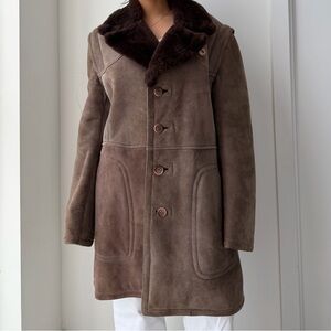 1970s Montreal Leather Garment Brown Sheepskin Coat - X-Large Brand: Montreal Leather Garment Details: Premium 100% sheepskin suede in rich chocolate brown with plush shearling fur shawl collar; single-breasted four-button front; curved patch pockets  Size: Label says 42, fits like XL Bust: 48 in. Shoulder: 19 in. Length: 36.5 in. Sleeve: 26 in. Material Composition: 100% sheepskin Made in Canada Condition: Good; small mark near the hem of the back as pictured, in otherwise good vintage condition with normal signs of wear Model is 5'3 and normally wears a size X-Small.