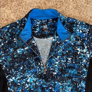 Tail 1/4 zip long sleeve golf top. Stylish fabric pattern design with blue black and white. Blue lining at raised neck. Black fabric inserts on sides for design and also is very slimming! Worn a few times only. In great condition and will go with all of your black bottoms all seasons!