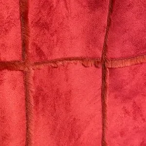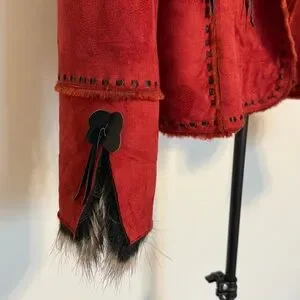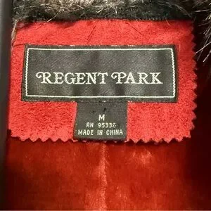 Regent Park faux suede coat in a deep red tone with plush faux fur trim. Cozy sherpa-style lining throughout with decorative whipstitch detailing.