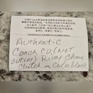 Authentic Coach Riley Chain Clutch in Colorblock, identified from the description in the handwritten note and confirmed by online listings.