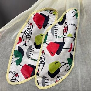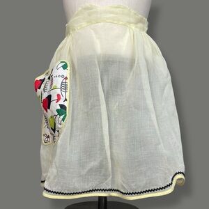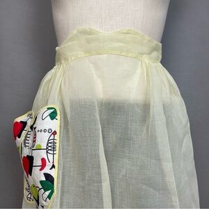 Vintage half apron in a semi-sheer pale yellow with abstract patterned pocket at the side and scalloped waistband. Ties at back waist and black ricrac trim around the edges.