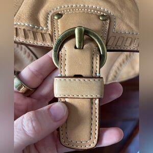 Authentic Coach leather hobo bag featuring whipstitch detailing, a braided leather handle, and a structured flap with buckle accent. This saddle tan bag has a soft, slouchy silhouette with boho and early-2010s Coach styling often associated with the Coach Poppy era.
