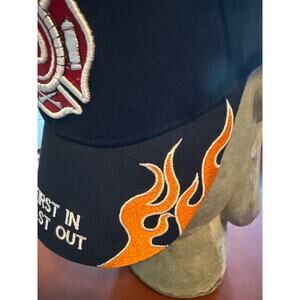 Fire Department ballcap with bold flame design and “First In, Last Out” text embroidered on front. Black with orange flame detailing along the brim.