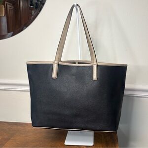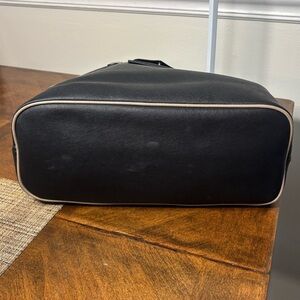 Elegant Marc Jacobs tote with black and tan leather. Features interior pocket and sleek design.