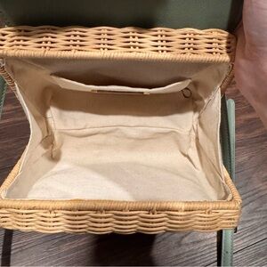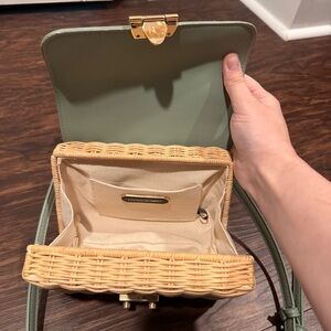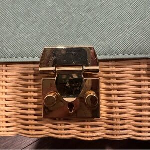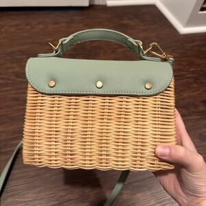 Chic and stylish mint green crossbody bag with a woven tan base. Perfect for adding a touch of elegance to any outfit.