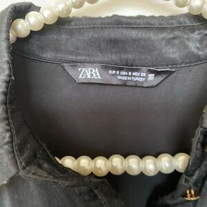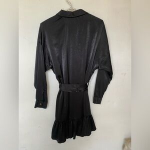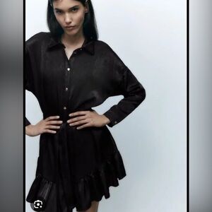 This elegant black dress from Zara is designed for a night out, featuring a notched collar and long dolman sleeves. The pleated skirt adds a sophisticated touch, making it ideal for cocktail occasions. Its buttoned front and flowing silhouette offer a stylish and comfortable fit.