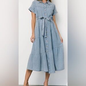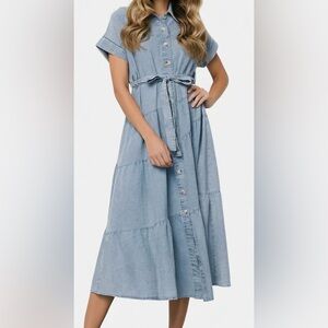 Elevate your style with this chic denim button-down midi dress. Perfect for casual outings, it features a flattering tie waist and classic collar. A must-have for any wardrobe. This dress has tiers that go on the diagonal, not straight across. It has functioning buttons that go all the way down and a denim tie. This dress has no pockets. It is a lighter denim material very comfortable.