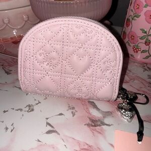 This elegant pink quilted wallet features a charming heart detail. Included inside is a heart shaped mirror and 6 dividers for practical usage.