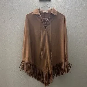 Stylish brown poncho with fringe detailing, perfect for adding a bohemian touch to your outfit.