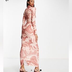 ASOS • ASOS DESIGN dress • structured dress • pink swirl print • marble print • long sleeve maxi • mock neck dress • fitted maxi dress • elegant evening dress • satin look dress • size 6 dress • special occasion dress • Y2K swirl print • trendy print • aesthetic dress