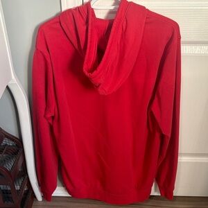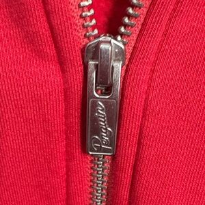 Bold red zip-up sweater by Original Penguin. Features a classic design with a front zipper and pockets.