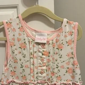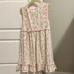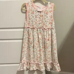 Adorable, light pink and white floral girls sleeveless sundress with button design on top two little pockets and ruffle trim on the bottom, pet and smoke free home size 6 no stains