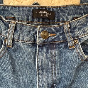 Ed Hardy Blue Wide Extra Baggy Jeans with Graphic Designs.