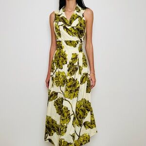 Elegant midi dress with olive floral pattern. Sleeveless design. Perfect for versatile occasions.