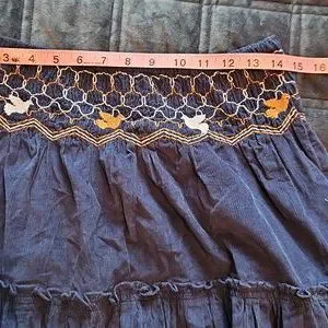 The set features a fitted, smocked crop tank and a coordinating tiered maxi skirt, both crafted from soft cotton, baby corduroy, with beautiful embroidered trim in pink, orange, and white accents.