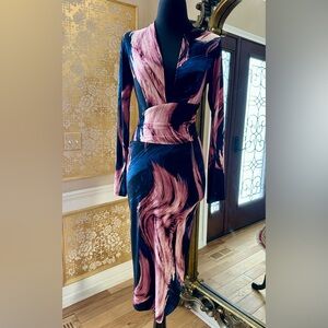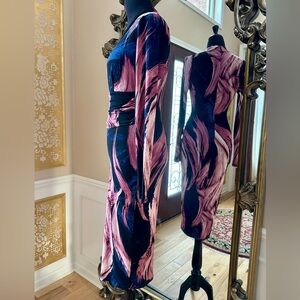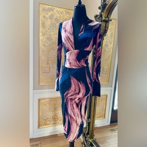 Elegant long-sleeve dress with abstract pink and blue pattern. Wrap style with a fitted silhouette. Midi Dress. Perfect for a night out.