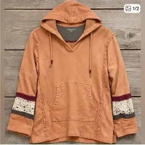 Coldwater Creek Peach Salmon Boho Hoodie with Lace Trim
