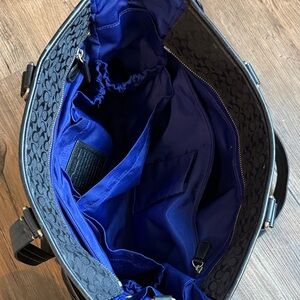 Stylish Coach laptop bag in black with cream stripe. Perfect for work or travel.