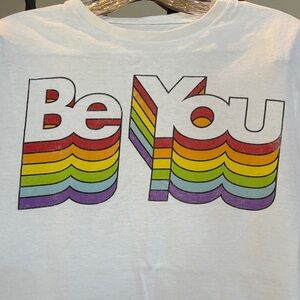 Encourage self-expression with the 'Be You' t-shirt featuring a vibrant rainbow graphic. Perfect for adding a pop of color to any outfit. Size medium discoloration on back of right arm. Please see pic.