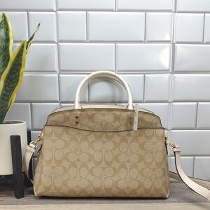 Elegant Coach satchel with signature pattern. Features tan and cream colors. Includes top handles and detachable strap.