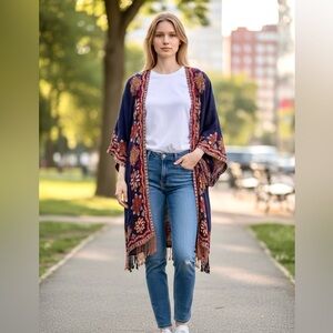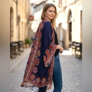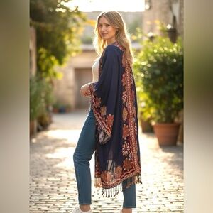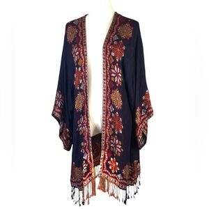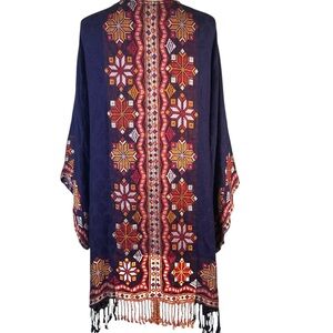 Elegant navy kimono cardigan with intricate embroidery. Perfect for adding a touch of bohemian style to any outfit.