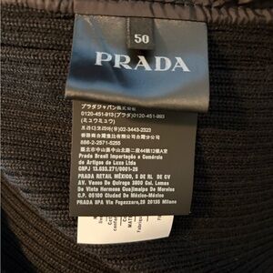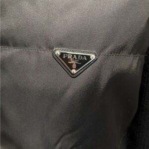 Stylish and modern Prada puffer sweater jacket with sleek design. Features iconic logo.