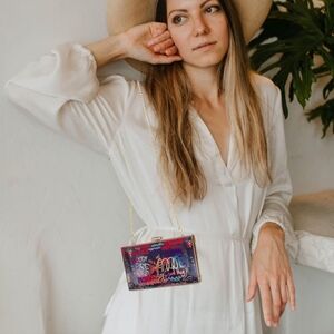 Stylish graffiti print clutch featuring a vibrant design. Comes with a chic gold chain for versatile wear. Perfect for adding a pop of color to any outfit.