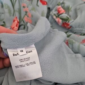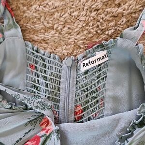 Reformation Nikita Midi Dress in Leona Floral Blue. This dress is characterized by a fitted bodice and waist with a relaxed-fit skirt. It features a sweetheart neckline and adjustable straps. The dress is made from a lightweight georgette fabric, specifically 100% Viscose