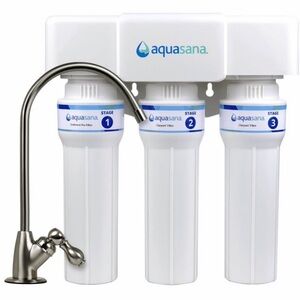 Aquasana water filtration system with three stages. Features a sleek brushed nickel faucet. Ideal for clean and safe drinking water.