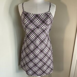 Chic mini dress with a purple plaid pattern. Features spaghetti straps and a fitted silhouette. Ideal for casual outings.