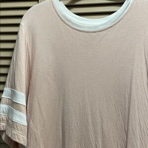 Varsity Tee, three-quarter length sleeve. Casual light pink tee with white stripe accents. Soft and comfortable for everyday wear.
