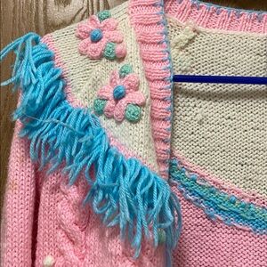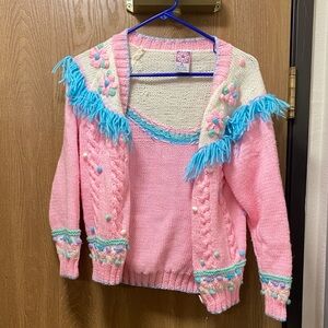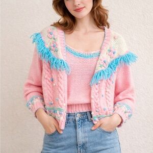 pastel pink knit cardigan layered over a matching knit top, featuring playful turquoise fringe trim across the yoke and shoulders. The cardigan is adorned with raised pom-pom detailing and floral-style knit accents in soft pink and blue, giving it a charming, handcrafted look. The knit texture is cozy and medium-weight, with ribbed cuffs and hem for structure. The cropped, slightly boxy silhouette feels distinctly retro—very late-70s to 80s cottagecore/kitschy aesthetic.