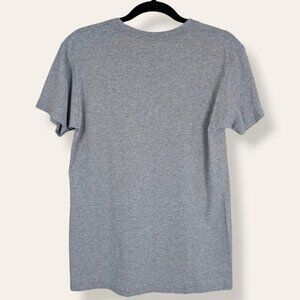 This vintage t-shirt, made in 2005, is made of a cotton/poly blend (90/10) and is grey with short sleeves. The front of the shirt has a red maple leaf with the iconic "I. AM. CANADIAN!" speech (see pic 2 for a zoom in). The shirt has normal wear, including some fading of the graphic, but no issues affecting wearability.