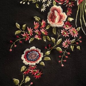 Chic black top featuring vibrant floral and bird embroidery. Perfect for stylish occasions.