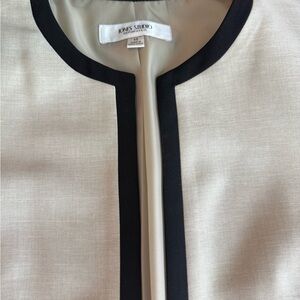This elegant cream and black women's jacket offers a sophisticated look for any occasion. The contrasting black trim adds a touch of modern style to the classic design.
