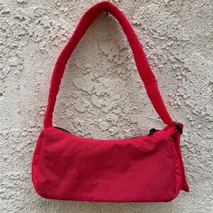 Brand new BAGGU Cargo Shoulder Bag in the color Candy Apple Red. A baguette style purse with two external magnetic flap pockets for quick access to essentials. Adjustable 29.5” quilted strap. Machine washable in recycled heavyweight nylon.