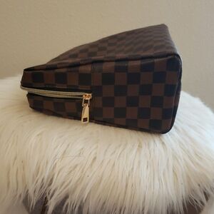 Roomy brown checkered makeup bag with red interior. Features a zippered pocket on the inside with 2 smaller pockets to fit all your toiletries or makeup. Measures approx. 11 in x 9 in x 3.5 in.