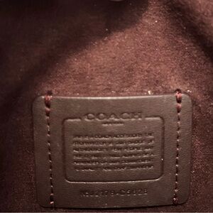 Coach Mini Brynn Crossbody Black Leather Purse Bag. A classic leather coach bag that can be worn on the shoulder or crossbody. Black cross grain leather with a fabric burgundy lining. Gold hardware. Shoulder strap is adjustable with belt style adjustment. Outside pocket. Gold coach spell out emblem & logo on outside. Gold snap closure. Inside has credit card slots and a zippered inside pocket. Still has attached matching leather hang tag. Labeled as a mini but more of a cross between mini & small. Surprisingly fits a lot of stuff inside. See pics for measurements. Good pre loved condition with some minor signs of wear. Has a couple little white marks on the trim of the bag. Has a small scratch on back if looking closely. Inside gold clasp has some marks. See last pics.