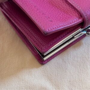 Luxe pink pebbled leather with multiple compartments for bills, coins and cards. Approximately 4" × 4.5". Snap closure for main compartment. Kiss-lock closure for 2-part coin holder.