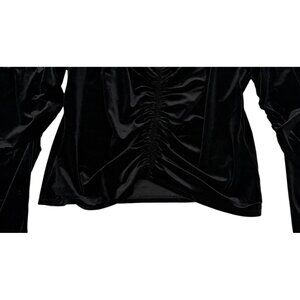 This elegant black velvet top from Express showcases a ruched front design and puffed long sleeves and square neckline. Size XL. Pre owned in good condition. No visible flaws