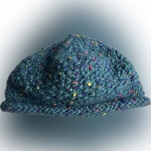 Vibrant blue/ aquamarine / deep teal hand knit beanie with multicolored speckles. Perfect for adding a pop of color to your outfit
