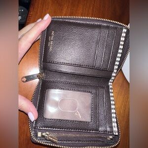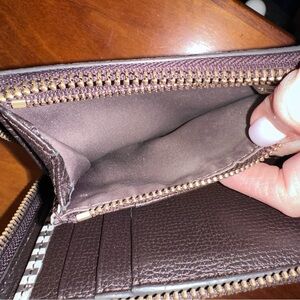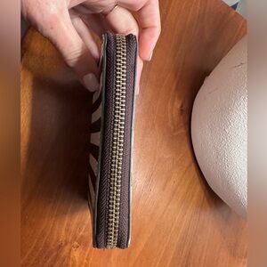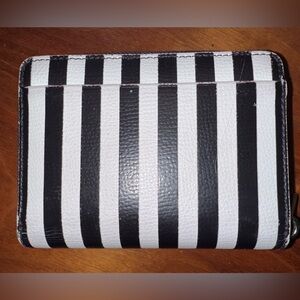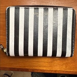 Stylish black and white striped wallet. Features zip-around closure. Iconic Henri Bendel design.