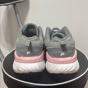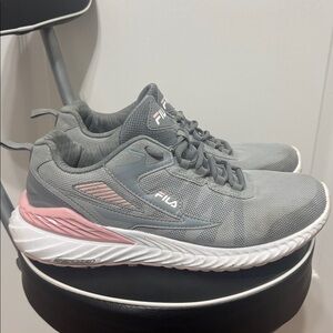 Stylish Fila sneakers in gray with pink highlights. Ideal for casual outings. Comfortable and trendy.