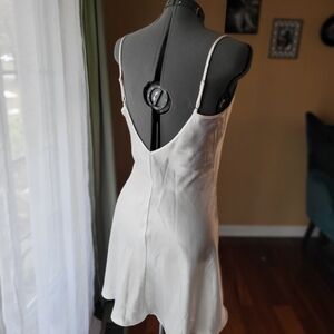 Ivory satin chemise with delicate lace accents. Soft and luxurious feel. Ideal for elegant sleepwear.