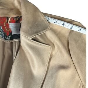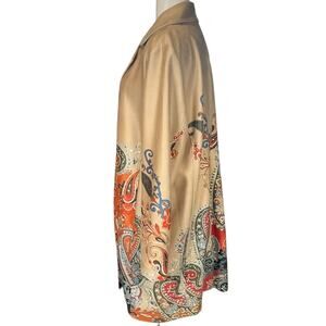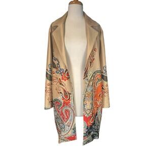 Beautiful long statement jacket by Chico’s featuring an all-over multicolor paisley print on a soft champagne-beige background. Designed in a flattering swing silhouette with wide lapels, open front styling, and dramatic flow for effortless layering.