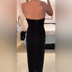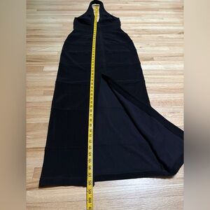 The tag was cut off, brand unknown. My guess is size 6. Well-made, thick material, lots of stretch. Zips up the back. See pics for measurements.
